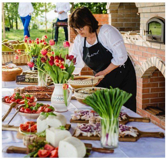 Picnic cu selectie de produse locale (ex: branza de Horezu, zacusca, salata de vinete, branza de Lovistea cu nuci si rosii la cuptor, lipie cu malai, muschi afumat de porc).